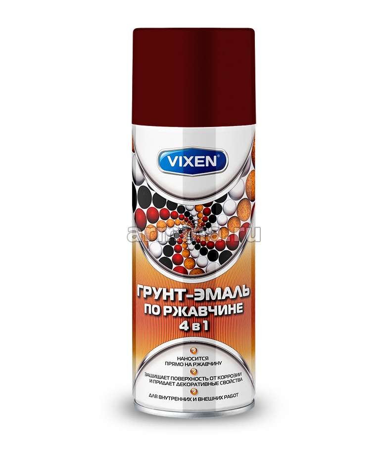 Быстросохнущая грунт-эмаль по ржавчине 4 в 1 VIXEN объединяет свойства грунта, антикоррозийного покрытия, декоративной эмали и защитного лака. Благодаря этому значительно сокращает время, которое обычно требуется для проведения каждой процедуры по отдельности (удаление ржавчины, грунтование и окрашивание).