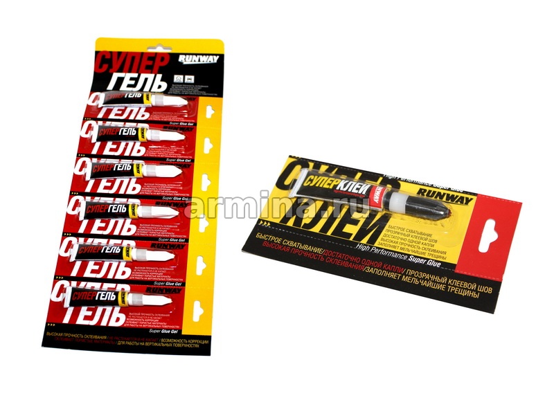 Однокомпонентный супер клей RUNWAY на основе этилцианакрилата, предназначен для быстрого склеивания различных материалов.