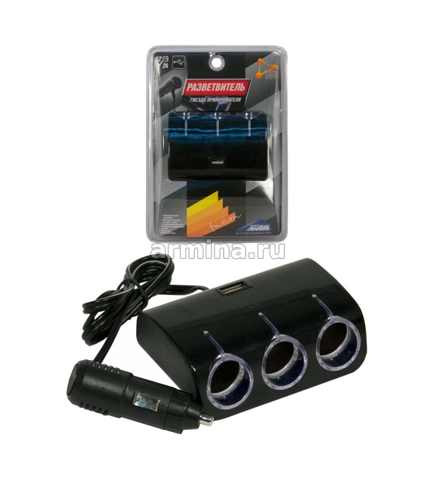 Разветвитель электропитания от прикур. "Nova Bright-fusion" 3 гнезда, 1USB, предохр. (44466) /80 - купить в интернет-магазине Армина