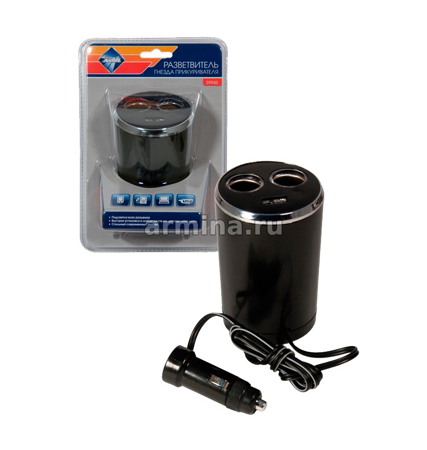 Разветвитель электропитания от прикуривателя "Nova Bright" на 2 гнезда, 1USB, в подст. (39945) /50 - купить в интернет-магазине Армина