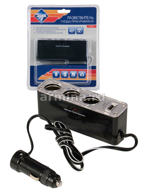 Разветвитель электропитания от прикуривателя "Nova Bright" на 3 гнезда, 1 USB, 12В /80 - купить в интернет-магазине Армина