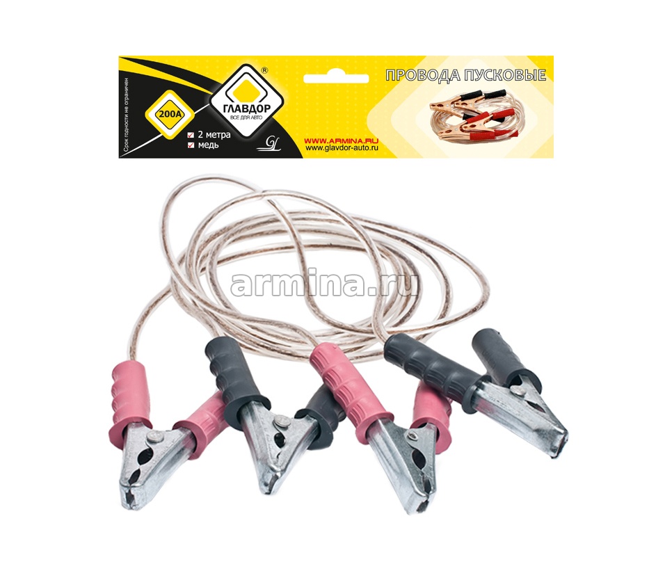 Рукоятки зажимов, как и сами провода, выполнены также из морозостойкого термопласта. Длина проводов 2м, что позволяет зарядить аккумулятор, даже если невозможно вплотную подъехать к автомобилю. Это особенно актуально в городских условиях. Пропускная сила тока до 200 ампер. Красный провод - плюс, черный провод - минус. Провода должны находиться в каждом автомобиле, так как они могут выручить в непредвиденных ситуациях.