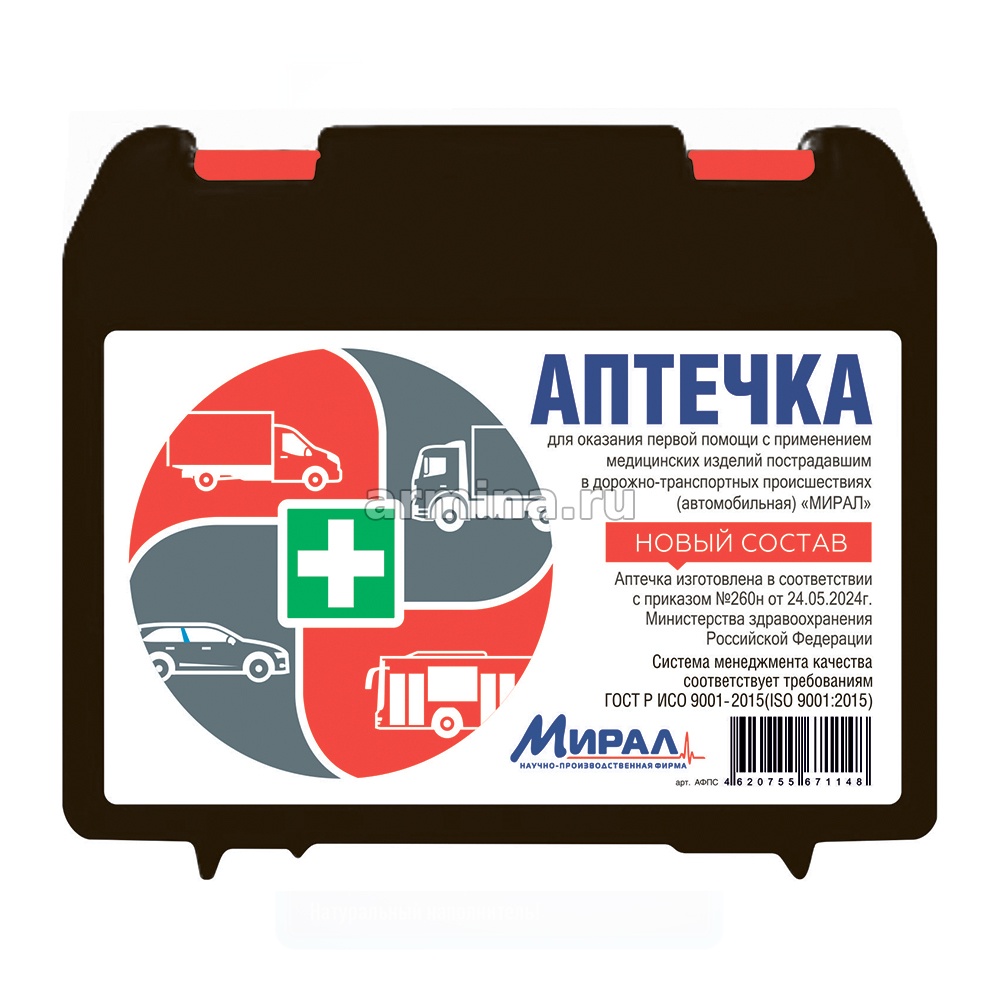 Аптечка первой помощи автомобильная "МИРАЛ" по п.24.05.2024г.№260Н (НОВЫЙ СОСТАВ), 20х16,5х7см /15 - купить в интернет-магазине Армина