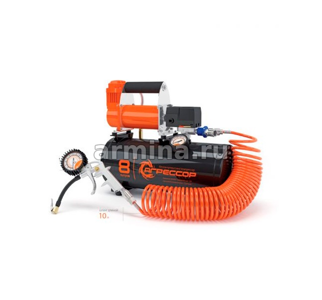Компрессор AGR-8LT с 8--литровым ресивером (ёмкостью для сжатого воздуха) предназначен для быстрого накачивания различных шин, а также может использоваться как источник сжатого воздуха для работы пневматического оборудования. Данная модель хорошо подходит для ровной усадки шины на диск при монтаже бескамерных покрышек.